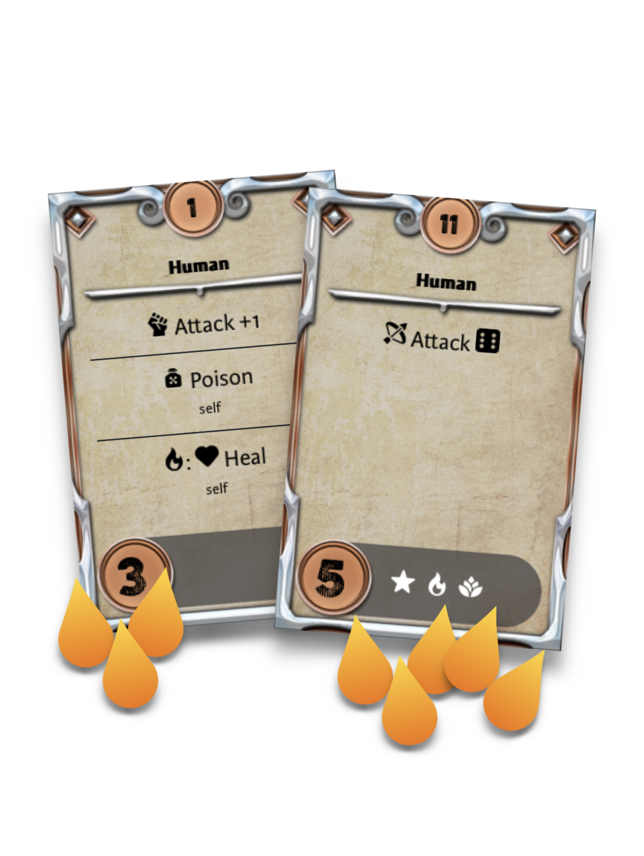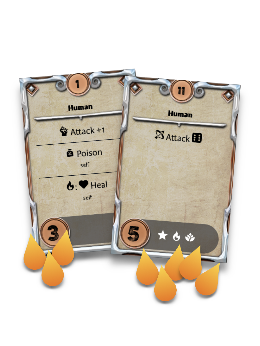 Stamina is how much effort you put in to your actions, which also means that it determines how quickly you act. The more stamina, the quicker you act which results in higher Speed. In the example here the player has picked two action cards, each costing a fixed amount of stamina, totalling 8. When comparing this number to both Heroes and Enemies, you can see who acts first in the round. If a Hero has the same speed as an Enemy, the Hero acts first. If two Heroes have the same speed, you decide yourselves which one goes first